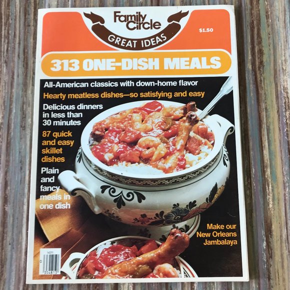 Family Circle Great Ideas: 313 One-Dish Meals magazine from 1978 has many recipes for "plain and fancy meals in one dish". Lots of interesting vintage ads, too! 128 pages, 8 1/4" x 11". Magazine front cover has creasing/marks, pages have blunt corner edges.