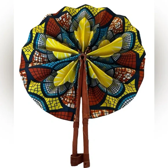 Beautiful African hand-held fan made from colorful Ankara or African fabric crafted in the genuine leather handle and
