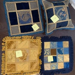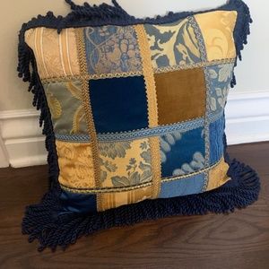 Beautifully handmade pillow covers. Bought in Florence, Italy a few years ago. Each pillow done by the craft maker is unique! Deep Blue and Gold colour story. The patchwork of fabric used: High quality satin, velvet, taping details, tapestry and fringes.