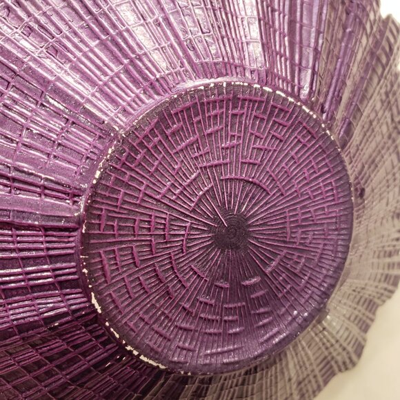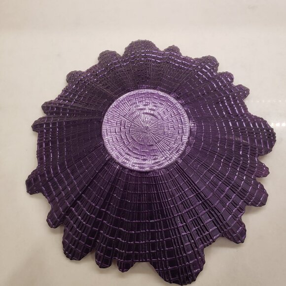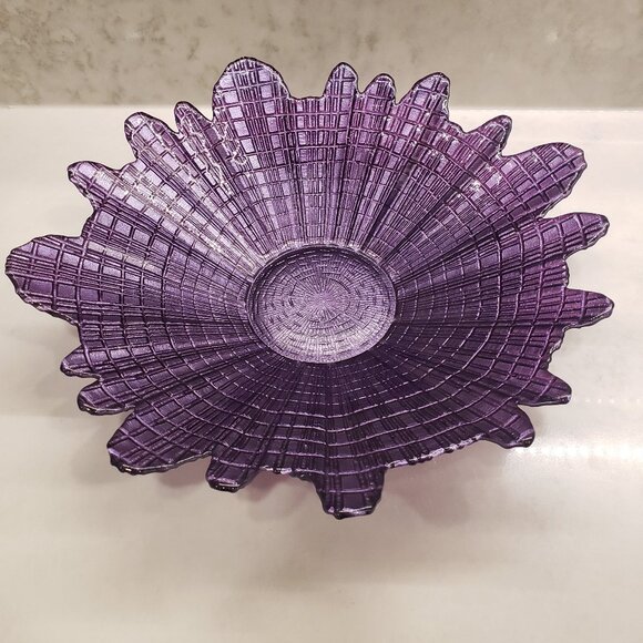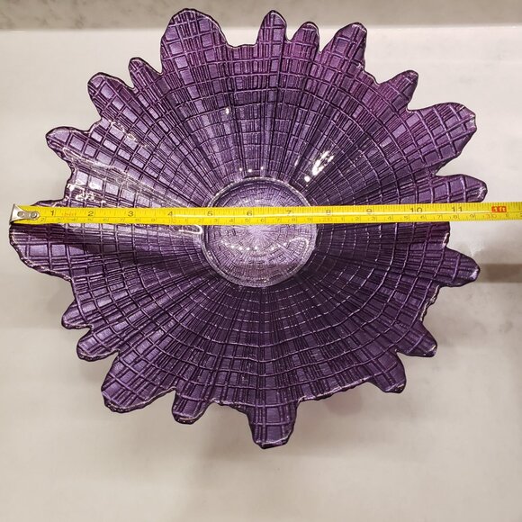As seen in pictures, some of the purple design has been worn away and these parts are clear glass on both sides of the dish