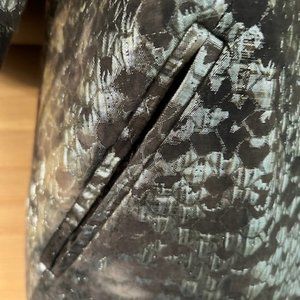 This is a great jacket that dresses up any skirt/dress or pair of pants ! Gold tones/brown tones - shimmery and sweet. No buttons and great rusched sleeves. Even has pockets and I love these because why oh why do soo many womens clothes not have pockets?? Do they think we dont have hands??? Really!! anyway - am off topic here. This jacket has everything