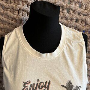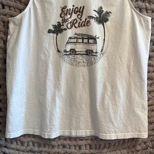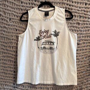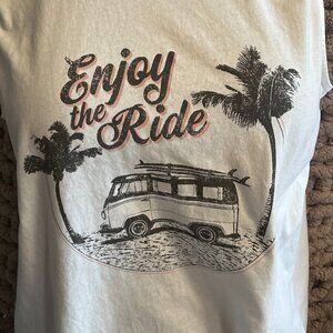 Catch those carefree summer vibes in this awesome Far West white graphic tank top! The retro-style print showcases a classic VW bus with surfboards, swaying palm trees, and the fun saying "Enjoy the Ride." This sleeveless tee is super comfy and perfect for layering or wearing on its own. A must-have for anyone who loves the beach, travel, and a touch of vintage flair. Excellent pre-owned condition.