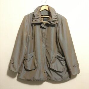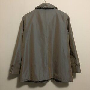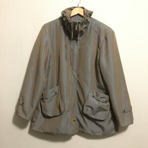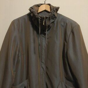 Very good preowned condition, greyish/tan-coloured, silky, sleek hooded jacket by Korean fashion brand, Faramos.This is an awesome, high quality jacket. It has that eclectic grandpa, student look going for it with the colour and short fit. The lining is multicoloured and reminiscent of those striped patterns that were popular in the 90s.