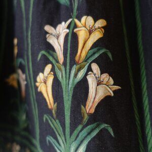 Introducing the Black Flowers Arch LENZING™ ECOVERO™ Euroflax™ Blouse by FARM Rio. This piece captures elegance with its playful floral patterns blossoming on a deep black canvas. The round neckline and gentle gathers create a soft silhouette, while long sleeves are adorned with intricate tassel ties. Crafted with responsible materials, this blouse effortlessly combines beauty and mindfulness, making it a captivating addition to your wardrobe.