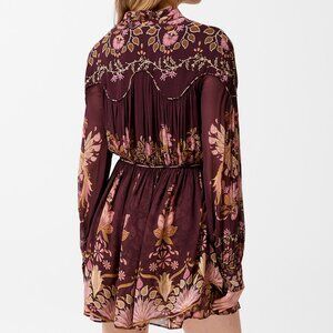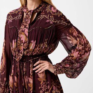 This lightweight crepe dress features a mysterious stylizes garden pattern and romantic details like the imposing tie ribbon at the neck and cute puff sleeves.