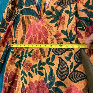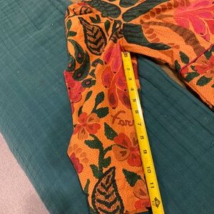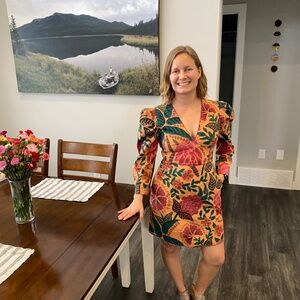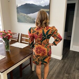 Farm Rio puff sleeve mini dress, 3/4 length sleeves, hits above the knees. Wore a few times, so many compliments on the bright colours and beautiful pattern!