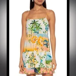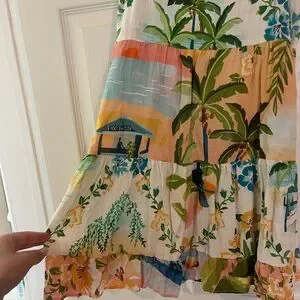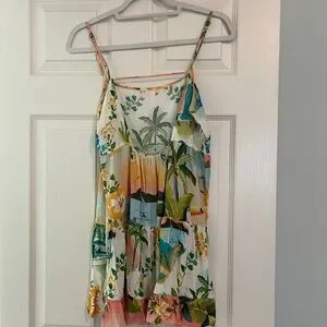 Tropical pattern, low back, adjustable straps, flowy, tiered skirt.