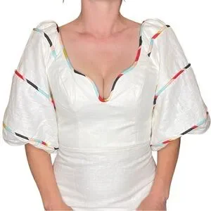 This dress has absolutely the most stunning details. Reinforced puff sleeves for an over the top look. Shoulder grips so those heavy puffs stay in place!