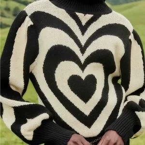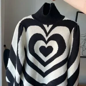 Stay cozy and stylish with this chic black and white heart pattern sweater. Perfect for any casual outing.