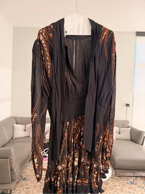Black FARM Rio mini dress with brown and cream floral print. Long sleeves and a cinched waist create shape. Lightweight, flowing skirt with subtle ruffle hem. Decorative rosette details at neckline and waist. Elegant for day or evening wear.