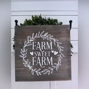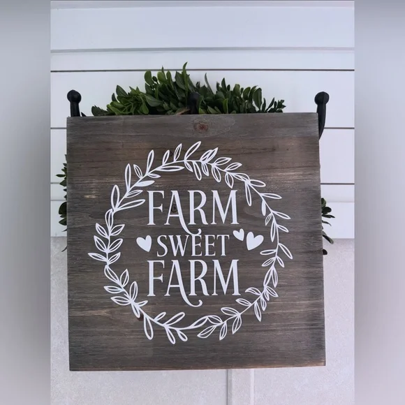 Rustic wooden wall sign with 'Farm Sweet Farm' design. Features white lettering and leaf accents.