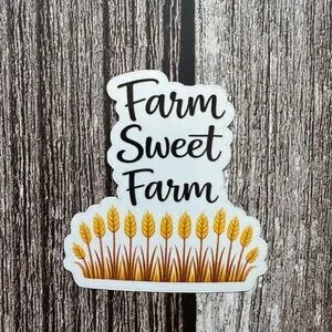 Charming 'Farm Sweet Farm' sticker featuring a wheat design. Perfect for decorating.