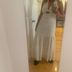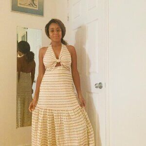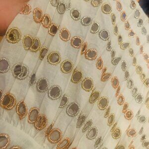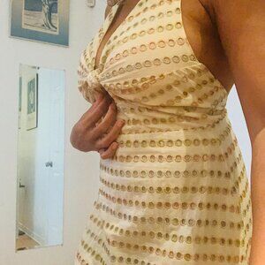 Robe Farm Rio. Robe neuve en coton style broderie anglaise tous le petits trous sont brodés avec de fils dorés et argent.Tissu fond beige. Ideal pour les fêtes de fin de l'an. **Attention la robe de la photo est de taille moyenne. Cellui qui je vend c'est un L - large. Disponible jusqu'a le 27 Novembre.