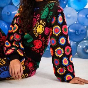 Vibrant sweater with smiley face design. Features multicolor patterns on a black base.