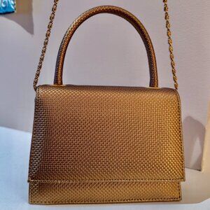 Farnell Paris bronze mini shoulder bag, in excellent almost new condition. Can be worn as shoulder or handbag. Gold link metal strap, black lined compartment with one zippered small pocket, snap fold over closure. Colour variations shown in photo are to the bag catching the light at different angles. Measures 6.5 inches long, 2.5 inches wide, and 5 inches tall. With shoulder strap measures 8.5 inches tall. Shoulder drop of metal strap is 23 inches. Cat friendly, nonsmoking home.