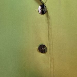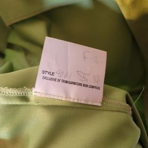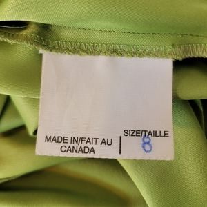 Bright green Farouche by Lori Weidner dress with matching blazer. Metal, silver tone buttons and chain style details. Fitted dress. Shoulder pads in blazer. This unique vintage outfit was made in Canada.
