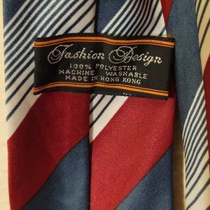 Excellent condition polyester necktie, in a blue, red, and white striped pattern.