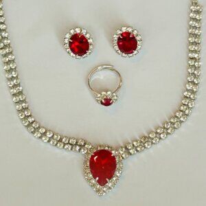 Costume jewellery set made of plastic diamonds & ruby/garnet