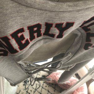 Cropped grey graphic sweatshirt with criss cross tie in the middle. Pairs nicely with super sexy sweats. Size Large.