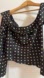 Chic off-shoulder design. Black fabric with white polka dots. Perfect for casual outings.