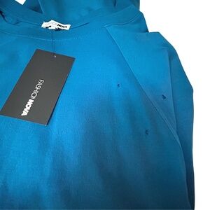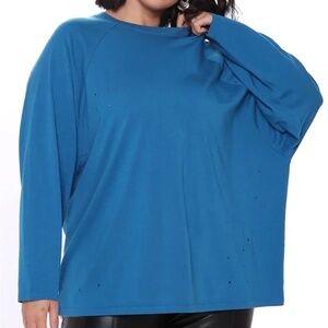 Features: Log Sleeve, raglan sleeve, laser cut distressed irrigation details, pullover design, ribbed neckline, stretch fabric