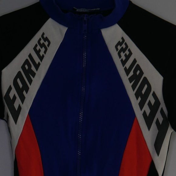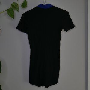 A blue, orange, black and white romper from Fashion Nova. This "racer style" romper zips from the waist to the neck. Choose to zip it all the way up to create a turtle neck or unzip as far as you want for different looks! The bottom part of the romper fits as short-shorts if you have a bigger booty if not it may be a little loose, however it looks extremely cute with pants overtop! The way the orange curves gives a slight "snatched" affect. Size XS.