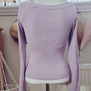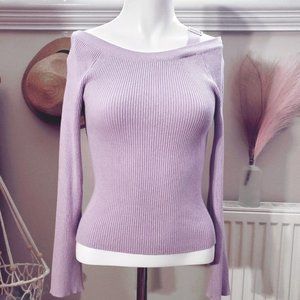 Lilac ribbed knit long sleeve semi off shoulder top with left strap detailing.