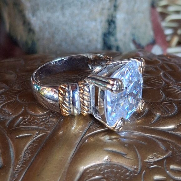 Costume jewelry that looks and feels fantastic! The stone is glass and held in with chunky gold and silvertone claws. The band is also silver with braided gold-tone accents. This ring is quite impressive. You won't be disappointed by its foolery.