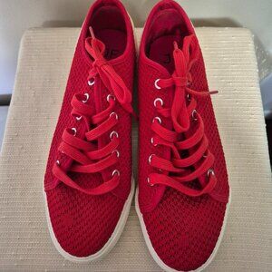 red, textured fabric red laces white trim, heel and sole note: red fabric shows through the heel cover size 9 gently worn
