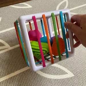 6 chunky, uniquely textured shapes fit through the elastic bands of the cube