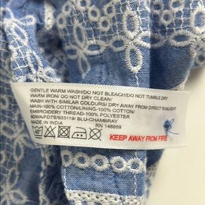 Beautiful embroidered blue and white dress. Adjustable straps and a removable belt (one of the strings to hold the belt has come undone, but doesn't compromise the dress) and pockets.