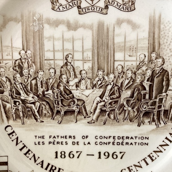 Great plate to use on Canada Day. Celebrate with the Fathers of Confederation. It’s a sturdy plate made in England by Wood and Sons which means you can put food on it. In excellent condition.