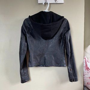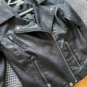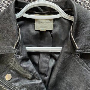 Black faux Silence and Noise Leather Jacket. Looks and feels like real leather, lovely soft and durable material with a lining inside. All functioning zips and pockets with a removable hood. Flattering slim fit. Light weight but decently warm. Bought from Urban Outfitters.