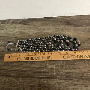 Lovely four strand necklace with faux black pearls, faux silver pearls, iridescent beads, light brown faux pearls and clear seed beads between each.