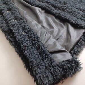 A whimsical hooded vest in a shimmering black shade. Made from a cozy cotton blend with a satin lining and no stretch. Fastens with snap buttons. Perfect for layering in fall, winter, spring, and cool summer evenings. Gently worn, great condition.