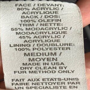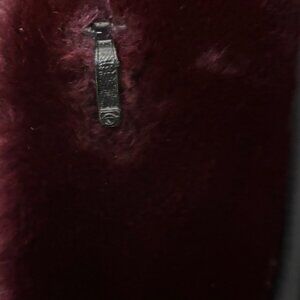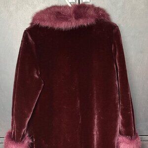 Burgundy hue with plush faux fur collar and cuffs. Inside lining is black.