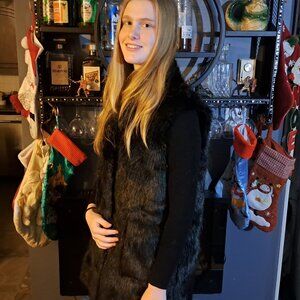 A faux fur vest made by Signature Collection size medium (8 to 10). It is black, has 2 inside pockets and has a belt/sash to tie on the inside. It is about 41" long.