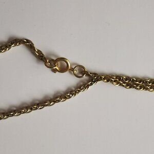 The cross pendant is made of a golden metal with a baroque style, the center of the cross is an oval cabochon filled with small green stones.