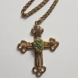 Faux Jade Stone Gold Tone Cross Pendant Necklace Vintage Gothic Rosary Baroque