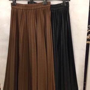 Faux Leather Pleated Skirt, in a sunburst pleat for a gorgeous silhouette, elasticated waist for a smooth A Line shape. Vegan faux leather for an earth friendly look with style. Fabulous multi season wearing; imagine wearing it with your favourite boots, for Fall, Winter & Spring. Gorgeous with designer tees & sweaters. Available in two colours Cognac Brown, Black Licorice.