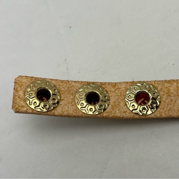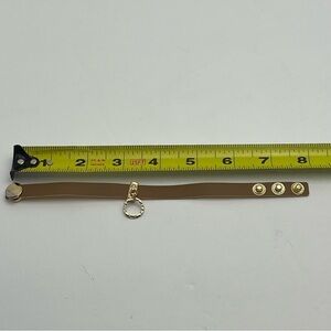 Hammered design circle charm on a faux leather strap bracelet. Has three snap closures to fit different sizes. Measurements are in pictures and in listing.