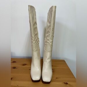 knee high boots, block heel boots, square toe boots, vintage boots, retro boots, 70s boots, western boots, cowgirl boots, witchy boots, beige boots, festival boots, faux leather boots, fall boots women, winter boots women