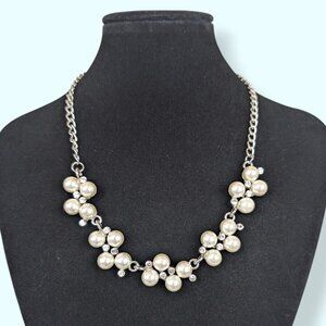 This demi parure includes a necklace and bracelet with matching faux pearl and white/clear rhinestone clusters. Both pieces are made with a silver tone metal and both have an adjustable lobster clasp closure. The necklace has 5 clusters and the bracelet has 3. The set has normal wear, but no issues affecting wearability. There are no missing stones or faux pearls.