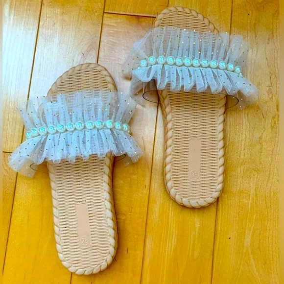Step into style with these elegant slides featuring delicate ruffles. Perfect for any occasion.