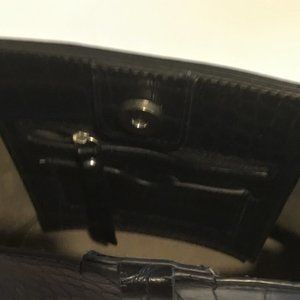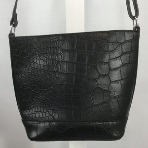 Black faux leather crossbody bag has adjustable strap. Small interior zip pocket and bank card pocket. Snap closure at top edge. Base is 4" x 7". Height is 8". Excellent condition! Nearly new.
