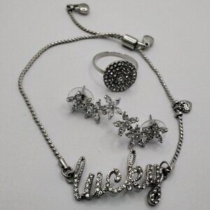 * The bracelet (adjustable size) features the word "lucky" in rhinestones, and has a small rhinestone heart as well.