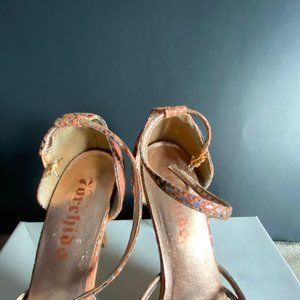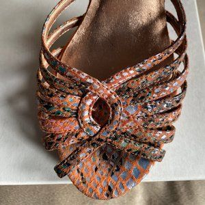 Absolutely stunning sandal for a summer party or wedding. Orange, black and silver mix. will jazz up any outfit. Barely worn no damage to strap and minimal scuffing. Like new