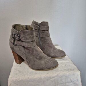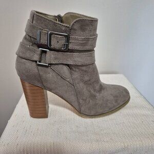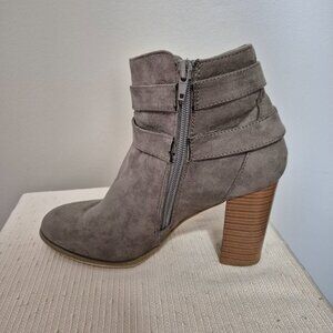 chunky, faux would heel - slight wear/scuff on back (see photo #4)