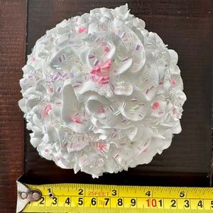 This faux whipped cream canister topper is the perfect accent for your kitchen display. This is made with white faux whipped cream, faux iridescent sprinkles, faux round sprinkles, and faux heart sprinkles.