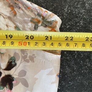 Faux wrap front and rounded hem at back which is longer than front. It says M but is more like L. It has orange, pink, white, brown floral pattern on cream and tan background. Green leaves. Excellent condition.